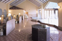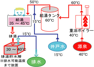 40℃の源泉を重油ボイラーで60℃に加熱して給湯タンクに入れ、井戸水を混ぜて35℃〜45℃の湯にする。排湯は貯水槽に貯め外気温度まで放置し、排水