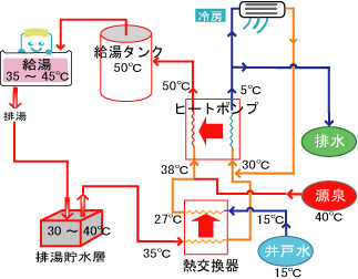 40℃の源泉をヒートポンプにより加熱、使用した排湯を熱交換器及びヒートポンプにより熱回収して排水