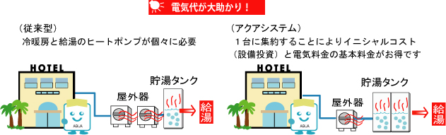 冷房時にエアコンの室外機から出る熱風を屋外に逃がさず、熱エネルギーとして再利用して貯湯タンクにお湯を沸かすことにより、電気料金がお得です。